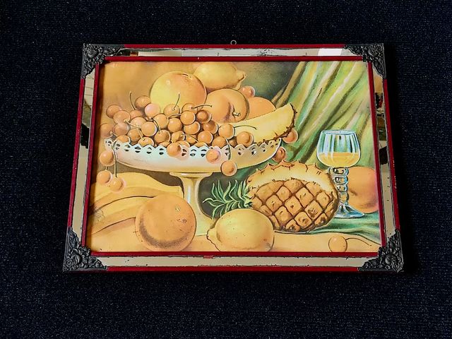 Detalhes do produtoQuadro com moldura em madeira de cor vermelha ocre com vidro translúcido, orlas espelhadas e cantos em folha de chapa trabalhada. Em relativo bom estado face à época de fabrico (provavelmente década de 1970).