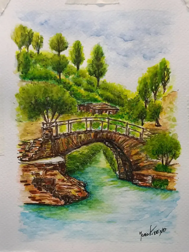 Pintura original em aguarela, com paisagem de ponte de pedra sobre um rio. Foz D'Égua Portugal - Dimensões: 15x20cm - Técnica: Aguarela - Tema: Paisagem natural