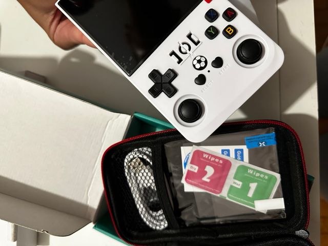Console portátil R36 Max. - Tela preta e branca. - Botões de controle. - Inclui cabo e kit de limpeza.