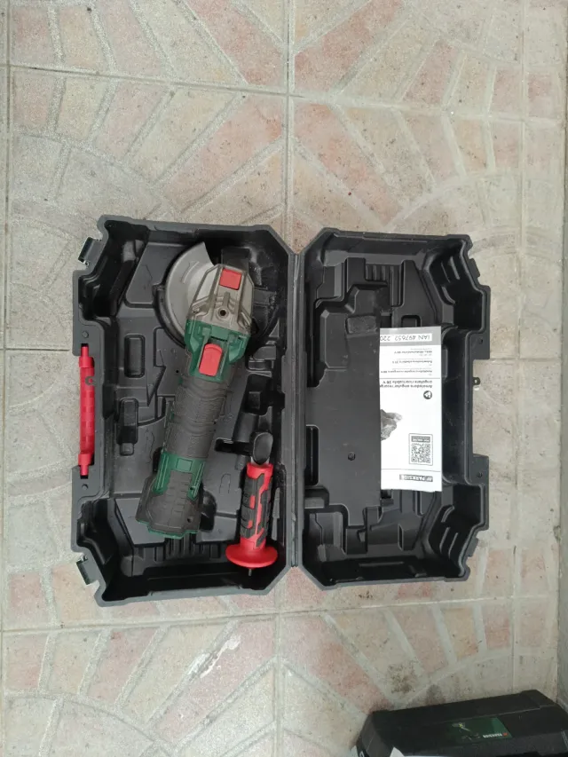 Detalhes do produtoRebarbadora Parkside a bateria de 20V, apresentada na sua mala original.