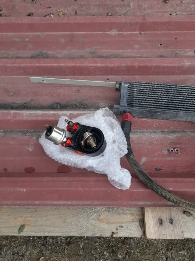 Refrigerador de óleo para motor. Inclui suporte e mangueira trançada.