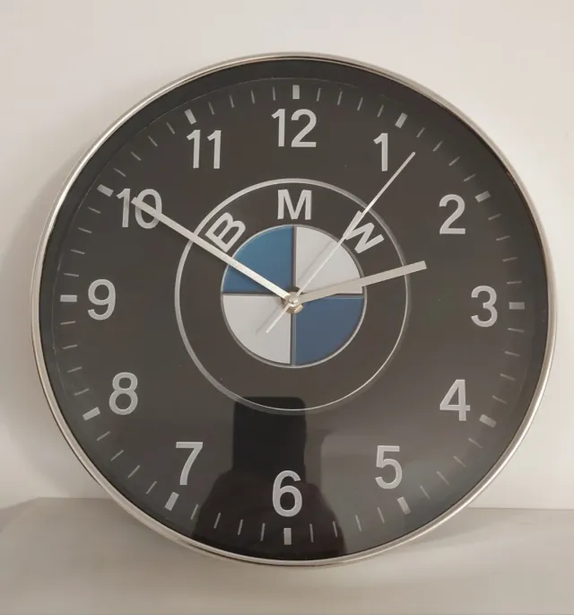Relógio de parede com o icónico logo da BMW. - Design moderno com fundo preto. - Moldura efeito cromado com 30 cm - Números brancos para fácil leitura.