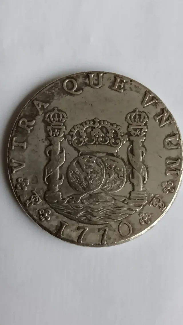 Detalhes do produtoRéplica de moeda antiga, comemorativa de 8 Reais de Carolus III, datada de 1770. A peça apresenta um design detalhado com coroas, colunas e elementos decorativos.