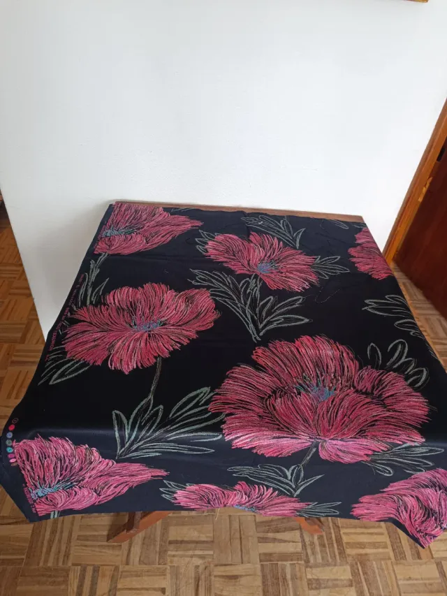 Detalhes do produtoRetalho de Tecido com um padrão floral vibrante em tons de rosa e azul sobre um fundo preto. As flores têm um aspeto texturizado e detalhado.
