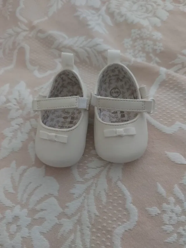 Sabrinas brancas para bebé, tamanho 1-6 meses. - Fecho de velcro. - Laço decorativo. - Sola antiderrapante.