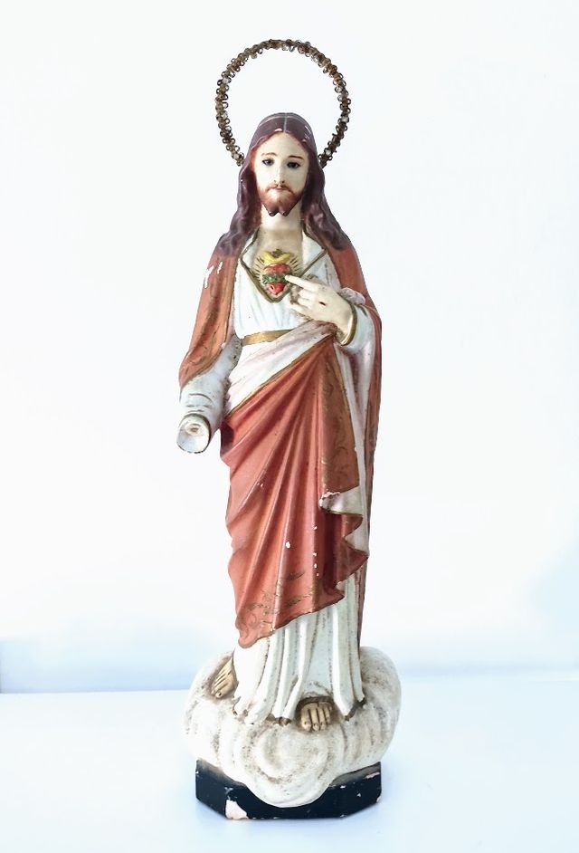Detalhes do produtoEnorme estatueta do Sagrado Coração de Jesus em terracota e olhos em vidro, de meados do século XX, supostamente fabricada em Portugal. Tem em falta a mão direita (desconheço se foi danificada ou retirada propositadamente por algum tipo de devoção/promessa pessoal, pois já chegou a mim nestas condições). Apresenta também falhas na pintura.
