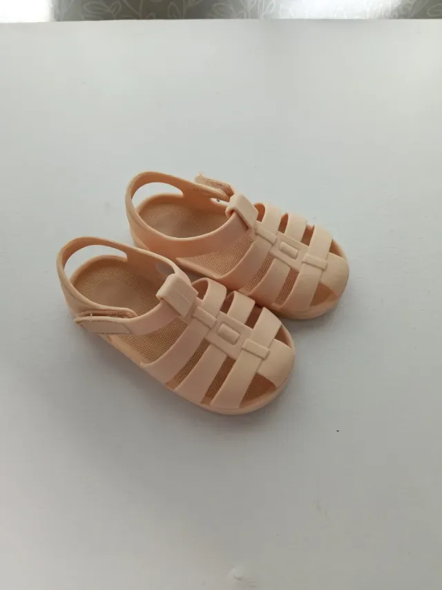 Sandálias de criança em tom pêssego, perfeitas para os dias mais quentes. - Material flexível e confortável. - Fecho ajustável.