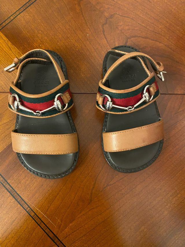 Sandálias Gucci originais com design clássico. - Tiras em lona com as cores verde e vermelha. - Detalhe de ferradura dourado - Tira de couro caramelo. - Fecho ajustável.