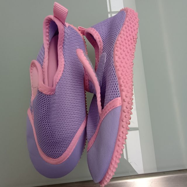 Detalhes do produtoTenho para venda um par de sapatilhas de água para criança, tamanho 28 (EU). São de cor lilás e rosa, com um design leve e respirável.