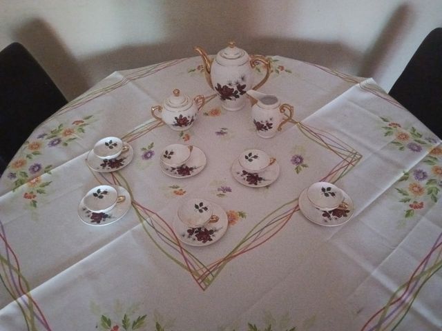 Detalhes do produtoConjunto de chá em porcelana com detalhes em dourado e rosas. Inclui 1 bule, 1 açucareiro, e 6 xavenascom seus pires. As peças apresentam-se em bom estado, com um design elegante e delicado. - 1 Bule