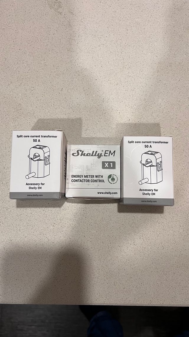 Detalhes do produtoConjunto de medidor de energía Shelly EM com controlo de contator e dois transformadores de núcleo dividido de 50A.