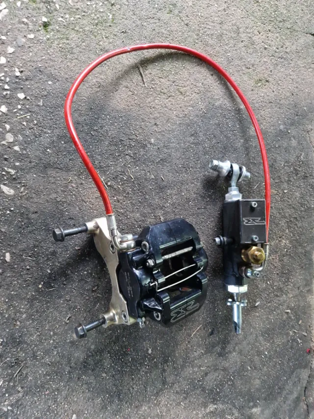 Sistema de travagem completo para trás para karting da marca DR Racing - Pinça de travão DR Racing. - Tubo de ligação vermelho.