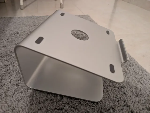 Suporte de portátil em alumínio com um design moderno e elegante. - Material: Alumínio - Cor: Prata - Design ergonómico