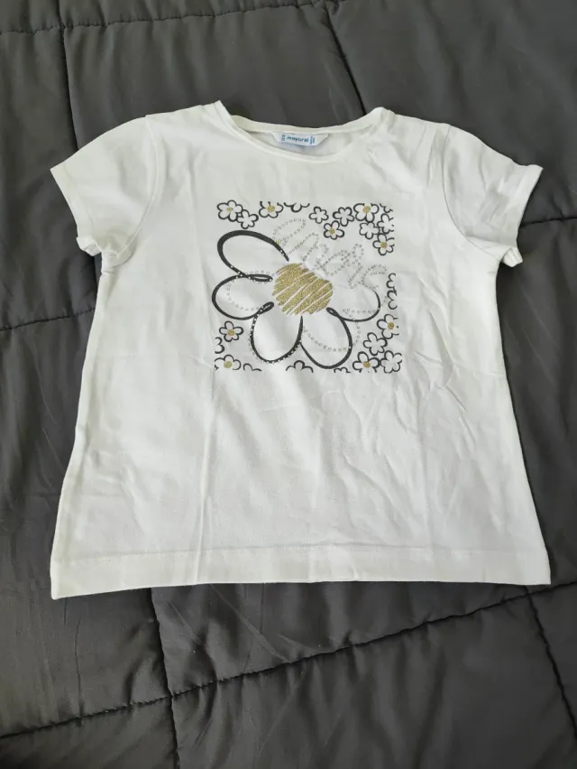 T-shirt branca da Mayoral, tamanho 6 anos, com um desenho de flor. - Desenho de flor com detalhes em dourado e pedrarias. - Manga curta. - Gola redonda.