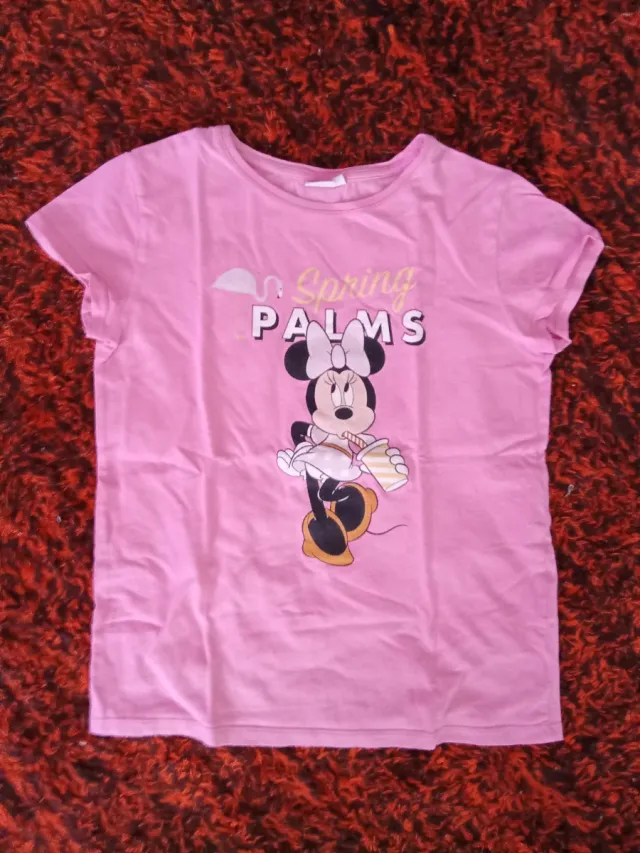T-shirt infantil de manga curta com estampa da Minnie Mouse. - Cor: Rosa - Estampa: Minnie Mouse com Spring Palms - Manga: Curta