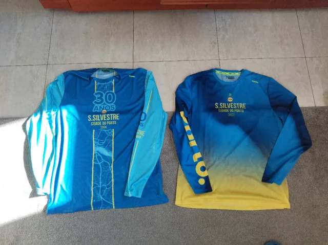 Detalhes do produtoConjunto de duas t-shirts de manga comprida para a corrida de São Silvestre do Porto 2023 e 2024. Uma t-shirt é azul com detalhes em amarelo e a outra é azul com gradiente para amarelo.