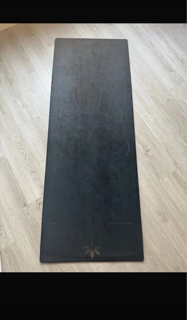 Tapete de yoga em preto, ideal para a prática de exercícios. - Design liso e elegante. - Textura que oferece aderência.