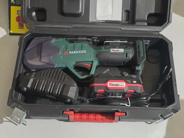 Tesoura de poda Parkside X20VTEAM em bom estado, com carregador e bateria. - Inclui serra, bateria e carregador. - Sistema X20VTEAM. - Maleta para transporte.