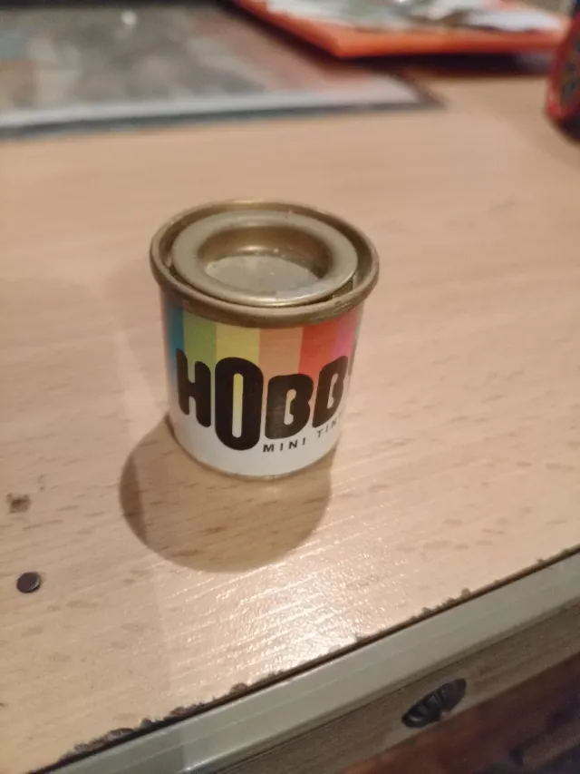 Detalhes do produtoTinta Hobby Mini de 16ml com acabamento dourado. A lata apresenta um design colorido com as letras HOBBY em destaque.