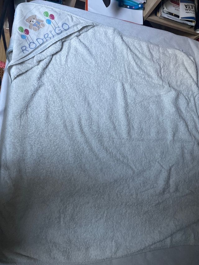 Detalhes do produtoToalha de banho infantil com capuz, personalizada com o nome Rodrigo. Possui um desenho de um ursinho com balões.