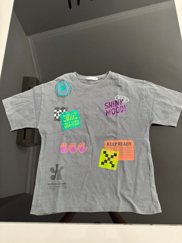Tshirt Zara de cor cinza com várias estampagens gráficas. - Estampa SHINY MOOD! - Estampa SHINE - Estampa KEEP READY - Estampa HERE WE STAND - Desenhos de mãos e padrões xadrez.
