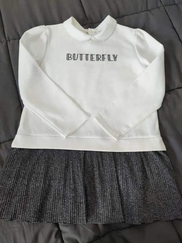 Vestido branco com saia plissada cinza e detalhes brilhantes. - Manga comprida. - Gola redonda com acabamento. - Estampa BUTTERFLY na frente.