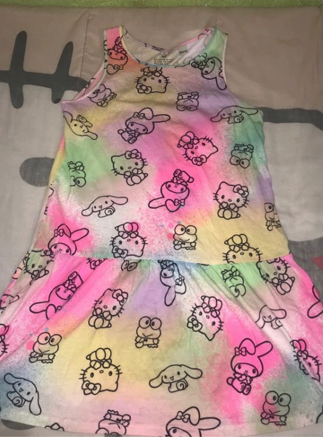 Vestido infantil da Zara com estampa tie-dye e personagens Hello Kitty.
