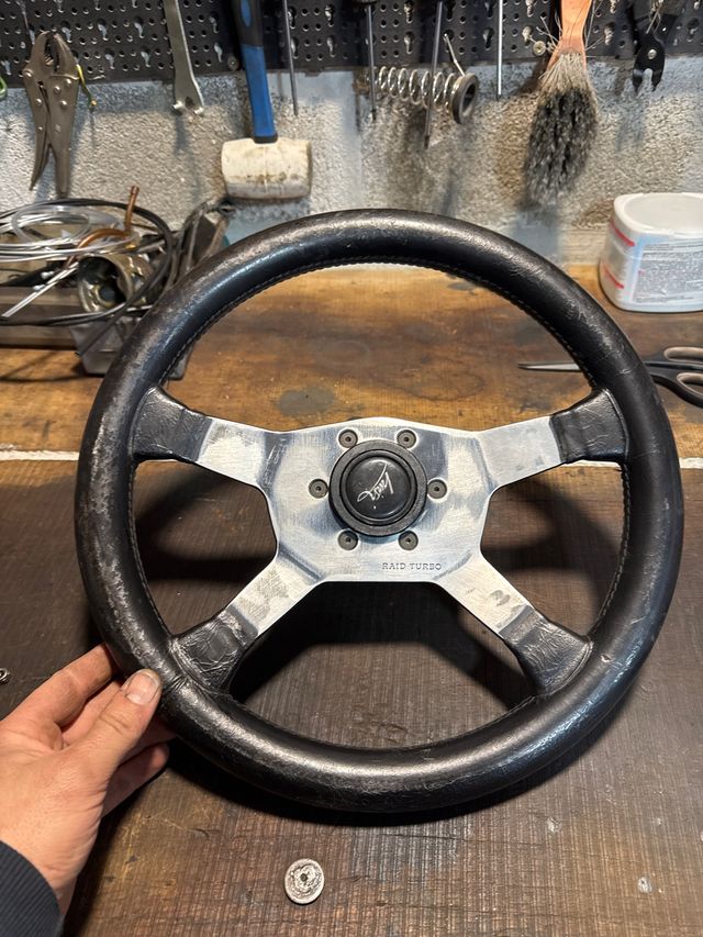 Volante desportivo RAID TURBO em pele, com cubo incluído. - Compatível com Golf MK3. - Design de 4 braços. - Acabamento em pele preta.