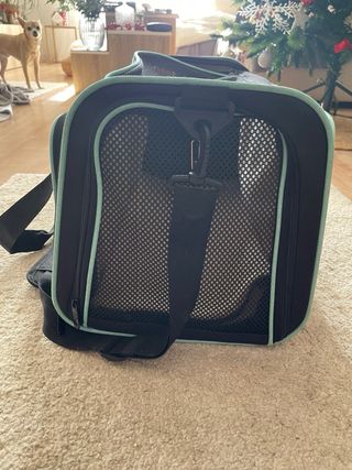 Transportadora para animais de estimação, com design moderno e funcional. - Cor preta com detalhes em verde água. - Alças de mão e alça de ombro ajustável. - Abertura superior com fecho de correr e rede para ventilação. pode ser usada com ou sem extensão preço em loja 89,90€