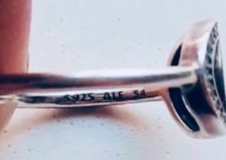 Anel da marca Pandora com design de elos entrelaçados e logo. - Detalhes em zircônia cúbica. - Gravação interna S925 ALE 54 indicando material e tamanho.