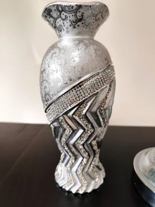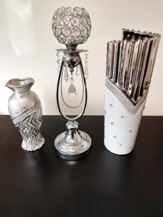 Lote de 3 imponentes elementos decorativos em tons de prateado em muito bom estado Elementos decorativos sem sinais de uso, sem defeitos ou danos (passam por novos) Garentem um toque de sofisticação e elegância a qualquer ambiente Preço para o conjunto dos 3 elementos Envio seguro (3 caixas dentro de caixa) Artigo 1 Jarra prateada com brilantes Material: Cerâmica Altura: 27 cm Peso: 486 gramas Artigo 2 Castiçal Material: Metal e plástico Altura: 48 cm Peso: 800 gramas Artigo 3 Jarra com brilhantes Material: Cerâmica Altura: 42 cm Peso: 1800 gramas