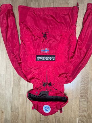Casaco tipo corta vento da Napapijri em vermelho. - Design com capuz. - Fecho frontal parcial. - Bolsos frontais. - Detalhe de logo na frente. - Patch com bandeira na parte inferior.