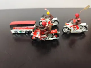 Lote de brinquedos antigos do Sport Lisboa e Benfica em muito bom estado Brinquedos com reduzidos sinais da idade, sem defeitos ou danos Camioneta Sport Lisboa e Benfica (SLB) 3 motas com adeptos do glorioso Preço para o conjunto Peso (total): 116 gramas