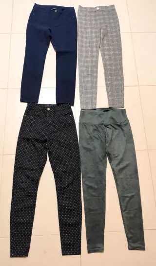 Lote de 4 calças justas de cintura subida de marcas prestigiadas em muito bom estado Calças para Mulher com reduzidos sinais de uso, sem defeitos ou danos Perfeitas para um look casual e confortável Preço para o conjunto das 4 calças Calças justas (Skinny) Calças 1 Calças azuis escuras Yessica (C&A) High Waist Tamanho: 36 (S) Calças 2 Leggings cinzentas com padrão Zara High Waist Tamanho: 36 (S) Calças 3 Calças pretas com bolas beges Strtadivarius High Waist Tamanho: 36 (S) Calças 4 Leggings desportivos verdes Doone Medium Waist Tamanho: 36 (S) Peso (total): 1100 gramas