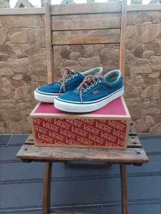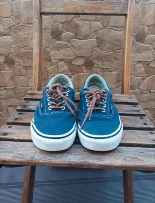 Tênis da marca Vans em azul e branco. - Cadarços marrons. - Detalhe em couro no calcanhar. - Solado branco característico da marca.