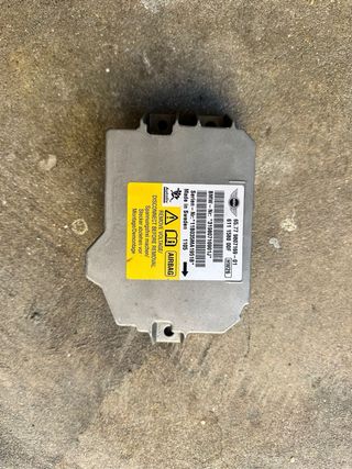 Centralina de airbag para Mini Cooper R56. Componente electrónico para el sistema de seguridad del vehículo. - Conector gris a la izquierda. - Carcasa metálica plateada. - Marcado con MINI y 11 en azul. - Inscripción 1008716 C5-1 en rojo.