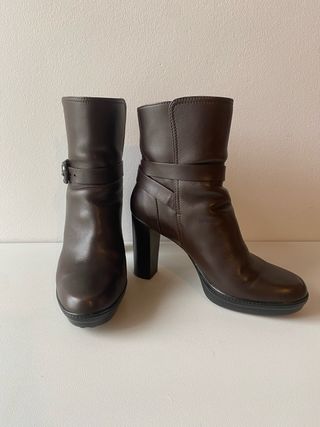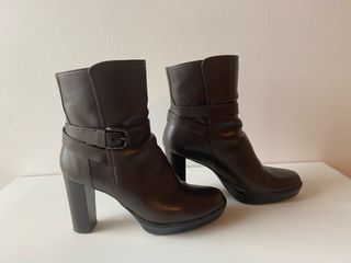 Botas elegantes em pele castanha. - Design com salto alto (10cm). - Detalhe de tira com fivela. - Em excelentes condições.
