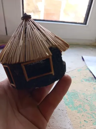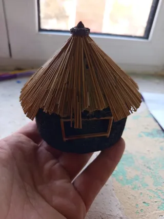 Peça de artesanato em formato de casa com telhado de palha. Material: A base feita de pedra vulcânica escura. Cobertura: O telhado é cónico e feito de palha ou material similar. Estilo: Representa um estilo de construção indígena tradicional. Origem Potencial: Pode ser artesanato de Cabo Verde, onde se usa pedra vulcânica para estas peças.