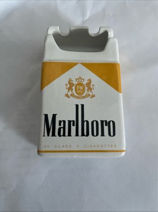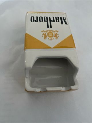 Cinzeiro vintage com design inspirado em um maço de cigarros Marlboro. - Formato de maço de cigarros. - Detalhes do logo Marlboro. - Acabamento em cerâmica branca e amarela.