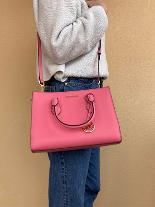 Mala Michael Kors Sheila Média em pele rosa. - Ferragens douradas. - Detalhe de logo MK circular. - Alças de mão. - Fecho de correr.