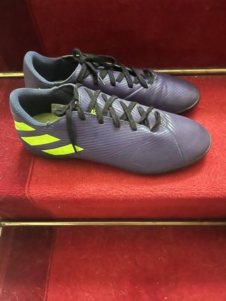 Chuteiras de futebol Adidas Nemeziz Messi 19.4 TF. - Design com listras. - Cadarços pretos. - Detalhes em verde neon.