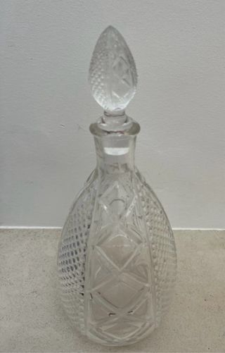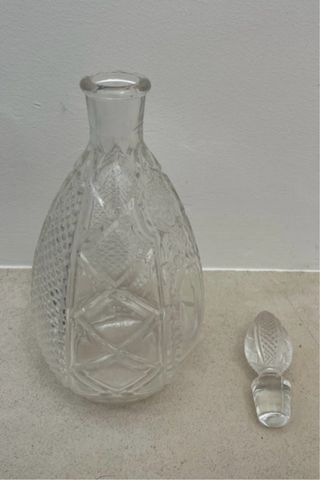 Decantador de vidro antigo com um padrão lapidado. - Design clássico e elegante. - Material: Vidro. - Acabamento lapidado detalhado.