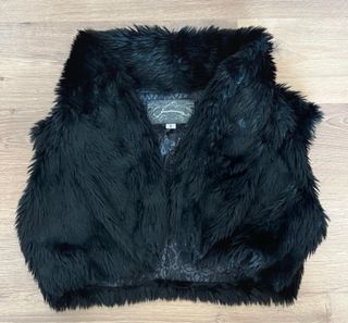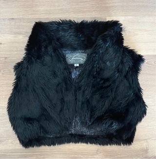 Bolero em pelo sintético preto da Stradivarius. - Material: Pelo sintético macio. - Design: Sem mangas, com gola alta. - Acabamento: Forro interior estampado.