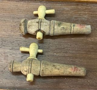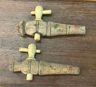 Conjunto de duas torneiras antigas em madeira, ideais para barris de vinho. - Peças com marcas de uso, conferindo autenticidade. - Design rústico e tradicional.