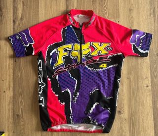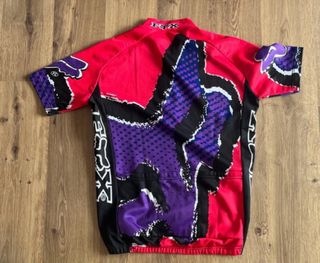 Camisola de manga curta com fecho frontal parcial. - Design vibrante com padrão gráfico. - Mangas em rosa choque. - Detalhes em roxo e amarelo.