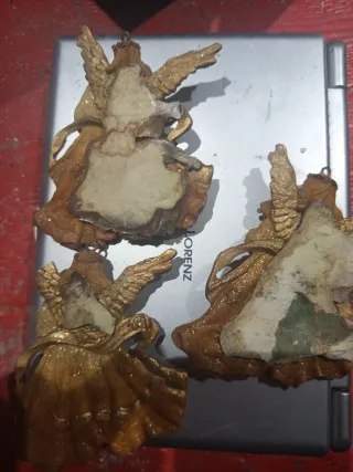 Conjunto de três anjos decorativos com acabamento dourado e detalhes em bege. Perfeitos para adicionar um toque festivo. - Design delicado com asas. - Cada anjo segura um instrumento musical. - Detalhes em glitter.