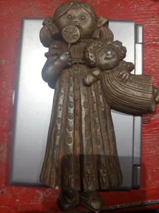 Estatueta decorativa de uma menina a segurar uma boneca. - Detalhes em relevo no vestido. - Acabamento em tom bronze.