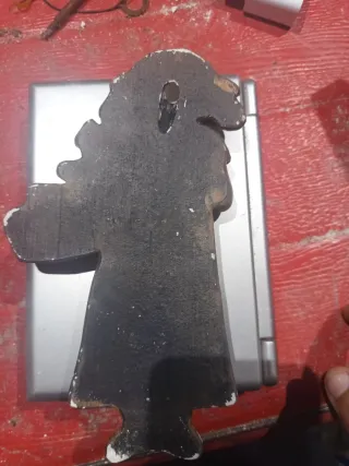 Peça decorativa da Sagrada Família em olaria policromada bronze. Representa a Virgem Maria, São José e o Menino Jesus.