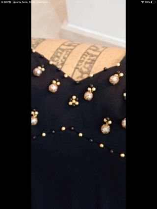 Obs - casaco curto da última foto é uma sugestão,nao esta incluido no preço,mas da jeito para quando se entra e sai de um ambiente quente para o frio. Macacão elegante em malha de seda italiana, perfeito para festas. Um outfit diferente de todos os outros para uma festa inesquecível. Macacão:Artigo de luxo em malha de seda italiana, com aplicações de alta qualidade,com um tom mais ouro velho que dourado e pérolas brancas,tecido duplo até acima das aberturas laterais,da altura de uma minissaia. Fluido,muito largo nas pernas e com rachas.Está bem atual. Fecho nas costas. Tamanho 44,veste um L,XL e até um M porque a malha seda tem