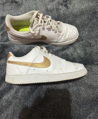 Sapatilhas Nike em branco com detalhes dourados. - Tamanho 40. - Design clássico e versátil.